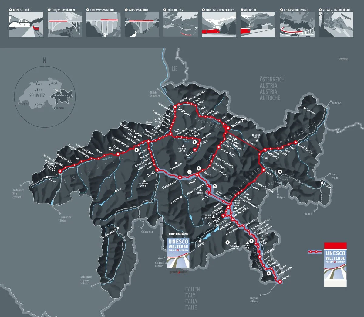 UNESCO 世界文化遺產:Albula Line (Chur - St Moritz) 與 Bernina Line (St Moritz - Tirano) 於 2008 年共同列入 UNESCO 世界文化遺產, 原因不只是景色壯麗,而是鐵路與自然環境高度融合,在未破壞山體的情況下完成跨阿爾卑斯的交通壯舉。